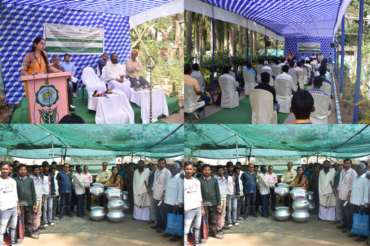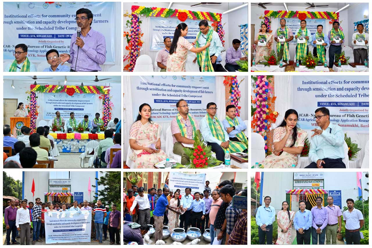 ICAR-National Bureau of Fish Genetic Resources, Lucknow, in collaboration with ICAR-Agricultural Technology Application Research Institute, Kolkata, and WBCADC KVK, Sonamukhi, Bankura, West Bengal, organised a sensitisation and capacity-building programme for scheduled tribe fish farmers at WBCADC KVK, Bankura on 29 August, 2023